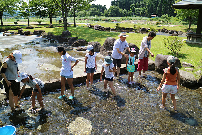 23日(土)は近くのアユパーク舟形にアユつかみに行って、捕まえたアユを焼いてみんなで食べました。その夜バーベキューと花火をしました。